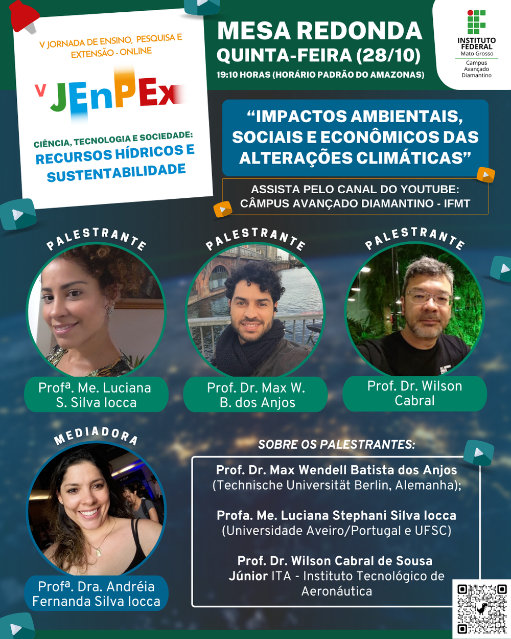 Mesa redonda 1 - “Impactos ambientais, sociais e econômicos das alterações climáticas” com a participação dos palestrantes: Prof. Dr. Max Wendell Batista dos Anjos (Technische Universität Berlin); Profª. Me. Luciana Stephani Silva Iocca (Universidade Aveiro/Portugal e UFSC) e Prof. Dr. Wilson Cabral de Sousa Júnior (ITA); mediado pela Profª. Dra. Andréia Fernanda Silva Iocca. Assista a essa mesa redonda a partir do minuto "49:32" clicando aqui.