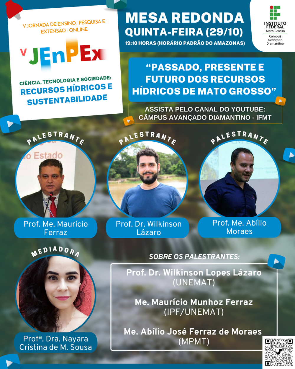 Mesa redonda 2 - “Passado, presente e futuro dos recursos hídricos de Mato Grosso” com a participação dos palestrantes: Prof. Dr. Wilkinson Lopes Lázaro (UNEMAT), Me. Maurício Munhoz Ferraz (IPF/UNEMAT) e Me. Abílio José Ferraz de Moraes (MPMT); mediado pela Profª. Dra. Nayara Cristina de Magalhães Sousa. Assista a mesa redonda clicando aqui.