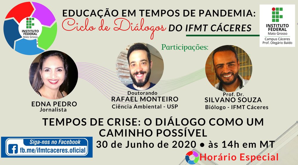"Tempos de Crise: O diálogo como um caminho possível" é o tema do VI Ciclo de Diálogos do Instituto Federal de Mato Grosso, IFMT Campus Cáceres – Prof. Olegário Baldo, na terça-feira (30/06), em horário especial, às 14 horas (horário de Mato Grosso) . Nesta edição, o evento terá as contribuições do pesquisador Rafael Monteiro (USP), autor do e-book: "Práticas do Diálogo em Tempos de Isolamento e Crise", e do professor Dr. Silvano Souza (IFMT), pesquisador da educação ambiental dialógico-crítica.
