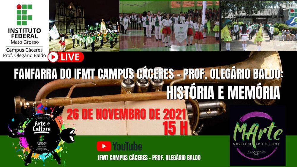 Narrativas sobre a história e a memória da Fanfarra do Instituto Federal de Mato Grosso, IFMT Campus Cáceres – Prof. Olegário Baldo serão apresentadas nesta sexta-feira (26.11) às 15 horas, no Circuito de Arte e Cultura do campus. O evento on-line com transmissão ao vivo pelo canal do IFMT Cáceres no youtube https://youtu.be/1XJSauGh4oc integra a programação da 3ª Mostra de Arte do IFMT, MArte 2021.