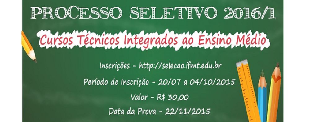 O Instituto Federal de Mato Grosso (IFMT) publica a relação de candidatos inscritos no Exame de Seleção (Edital 61/2016) para cursos técnicos integrados ao ensino médio, assim como o ensalamento de cada um dos candidatos. A prova será aplicada no dia 22 de novembro de 2015, com abertura dos portões às 13 horas, início às 14 horas e três horas de duração.
