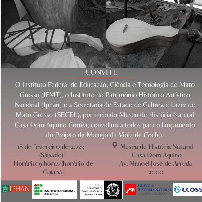 As três instituições assinarão um acordo de cooperação técnica com o objetivo de salvaguardar e disponibilizar matéria-prima para a confecção da Viola de Cocho. O lançamento do trabalho colaborativo será no Museu de História Natural Casa Dom Aquino, às 9h, e contará com a presença de cururueiros da cidade de Poconé (MT).