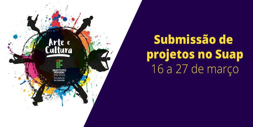 Os projetos podem ser submetidos no período de 16 a 27 de março. A inscrição será feita mediante cadastro da proposta, exclusivamente, no SUAP – módulo extensão (Foco Tecnológico – Arte e Cultura).