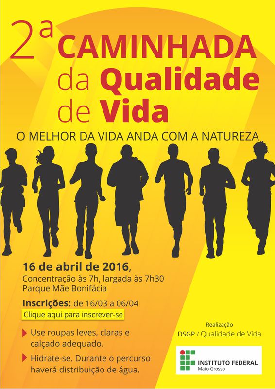 Link para inscrições: https://dsgp.ifmt.edu.br/conteudo/evento/ii-caminhada-da-qualidade-de-vida/