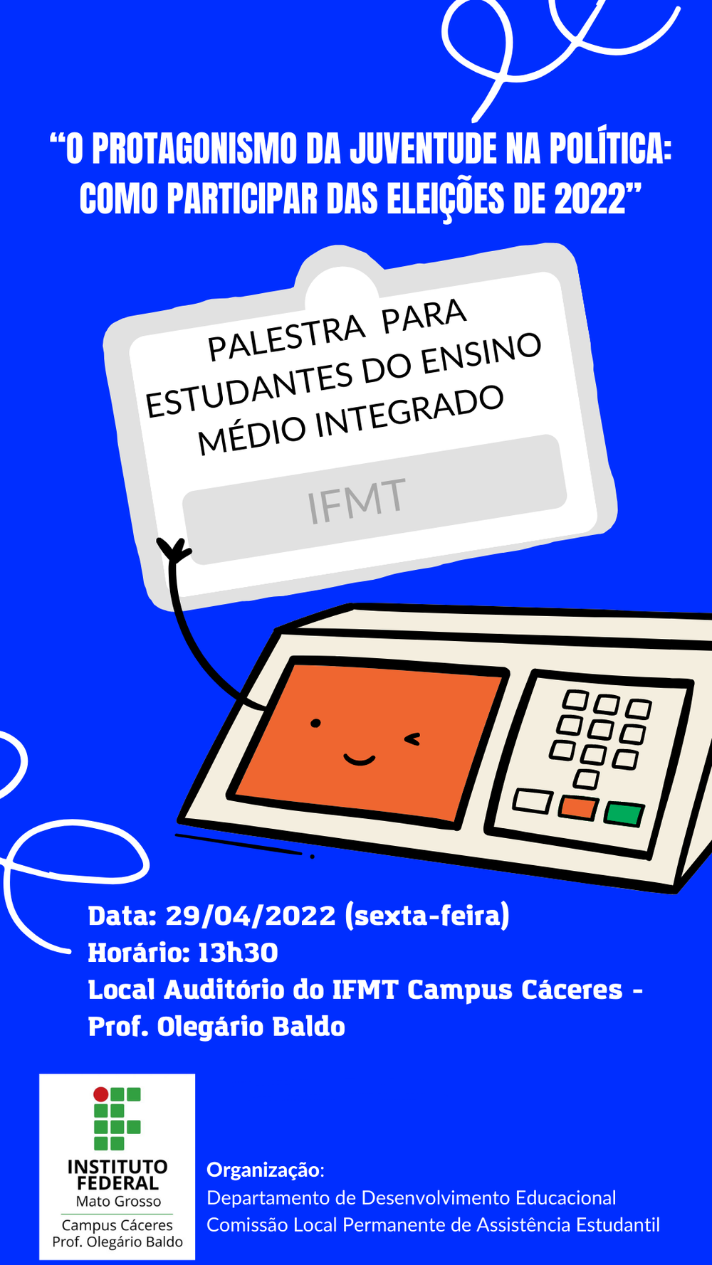 O Instituto Federal de Mato Grosso, IFMT, Campus Cáceres – Prof. Olegário Baldo, realiza, na tarde de sexta-feira (29.04), mesa de diálogo voltada para jovens estudantes dos cursos técnicos integrados ao ensino médio sobre o tema “O protagonismo da juventude na política: como participar das eleições de 2022.
