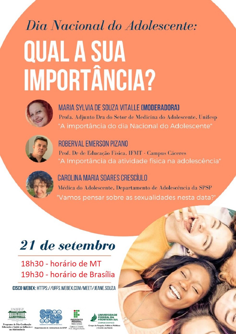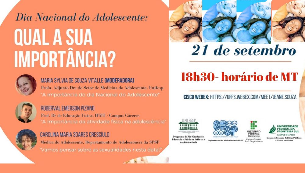 Em referência ao Dia Nacional do Adolescente (21.09), a Universidade Federal de São Paulo, Unifesp, por meio do Programa de Pós-graduação em Educação e Saúde na Infância e Adolescência, em parceria com o Departamento Científico de Adolescência da Sociedade de Pediatria de São Paulo (SPSP), Grupo de Pesquisa Politicas Públicas e Gestão em Saúde da Universidade Federal da Fronteira Sul, UFFS, Campus Chapecó e o Instituto Federal de Mato Grosso, IFMT Campus Cáceres – Prof. Olegário Baldo, realiza nesta segunda-feira (21.09.2020), às 18h30, horário de MT, encontro virtual com o tema ‘Dia Nacional do Adolescente: Qual a sua importância?’