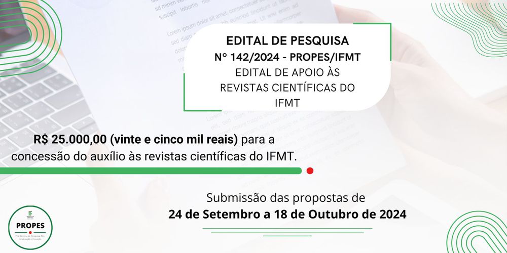 A Propes - Pró-reitoria de Pesquisa, Pós-Graduação e Inovação divulgou o edital de apoio às revistas científicas do Instituto Federal de Mato Grosso (IFMT). O objetivo é estimular o desenvolvimento de soluções técnicas e tecnológicas e estendendo seus benefícios à comunidade por meio das revistas científicas do IFMT. Amanhã, 24 de setembro, inicia o período para submissão dos projetos, de acordo com o Edital N° 142/2024.